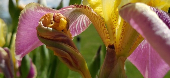 There are signs of strong roots as the breeze gently sways the perennial iris. Unflinching near the earth, the graceful oscillation builds upward, as does the colorful display. Off-shoots emerge from the sturdy, deep green foundation. Nearest the ground resides a tightly closed bud, perfect in its anticipation. Full of promise, it quietly awaits its turn in the sunny spotlight.