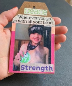 The next time I created a talisman of sorts was when my father-in-law was dying. When we learned time was short, I again experienced a pressing needing to have something on hand for the impending transition. I found a blank wooden ornament in our craft bin. On it, I affixed photos of my kids, inspiring words, and the Confucious quote: Wherever you go, go with all your heart. It was close by as he navigated his end of days. And now it, too, resides on my bookshelf.