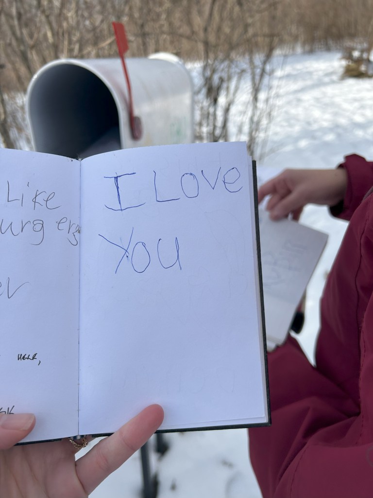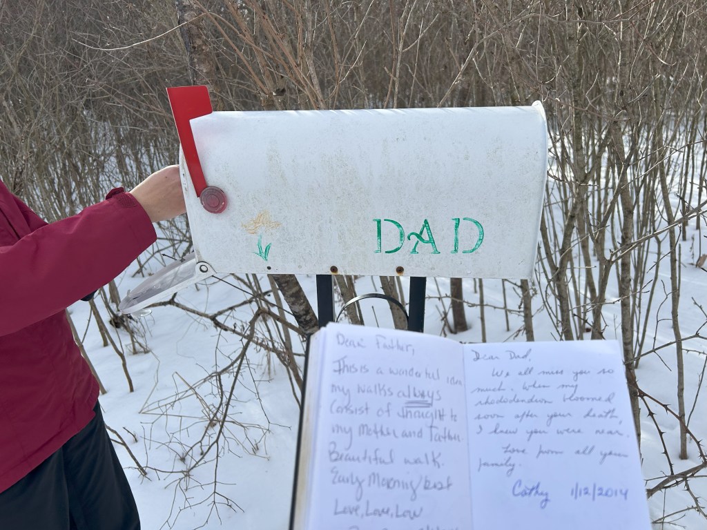 It was Barry Lampke. He’d been missing the connection he had shared with his father before his death. They used to write letters to each other. That’s how they bonded. So, Barry began writing again, leaving his letters in this mailbox with “DAD” painted on the side. Soon others were leaving notes and even some blank journals, inviting more entries–messages of love, longing, and gratitude as well as stories of the weight of living alongside grief.