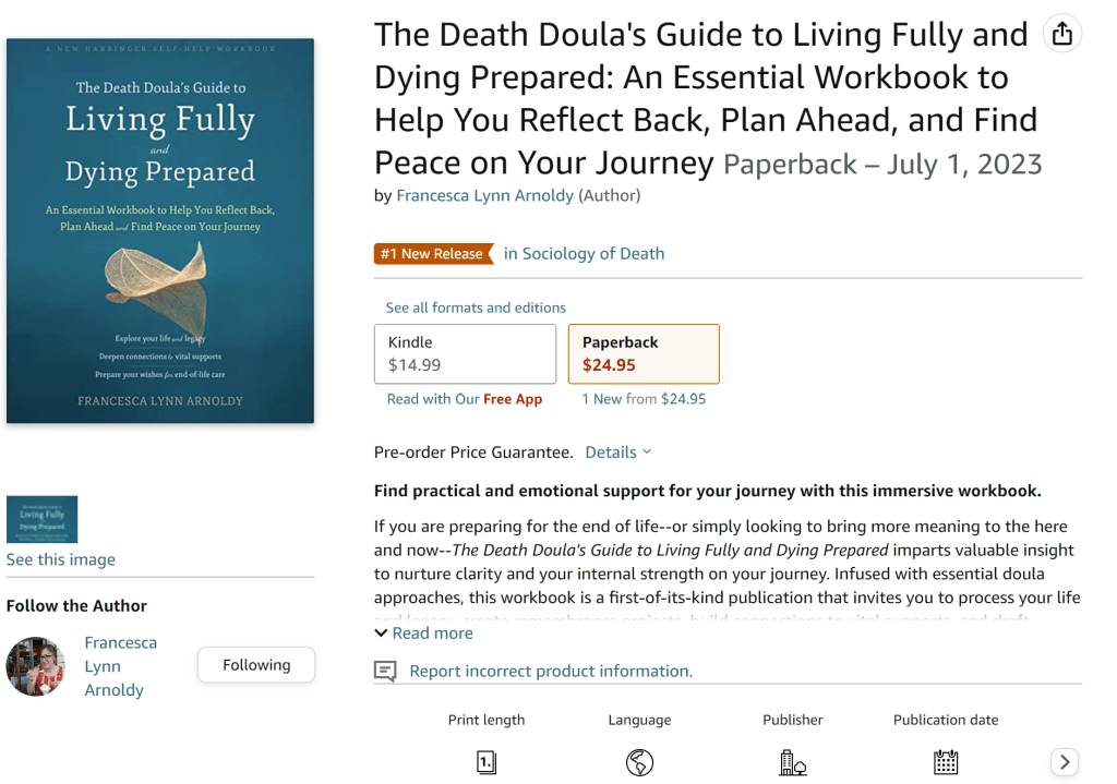 “This is a well-organized, generous encouragement toward death wellness, grounded in compassionate action. Accessible exercises and practical resources for doulas, care partners, and curious people exploring their relationship with mortality.”