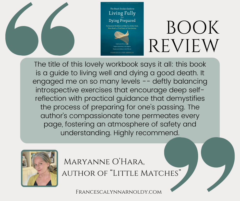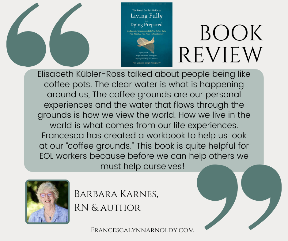 “The Death Doula’s Guide to Living Fully and Dying Prepared by Francesca Arnoldy provides readers with the tools to incorporate a healthy awareness of death as they navigate life. The practical reflections and exercises included in the book can calm fears of death and catalyze growth in consciousness and joy. This workbook should be on every kitchen table to bring essential conversations about mortality back into day-to-day life.”