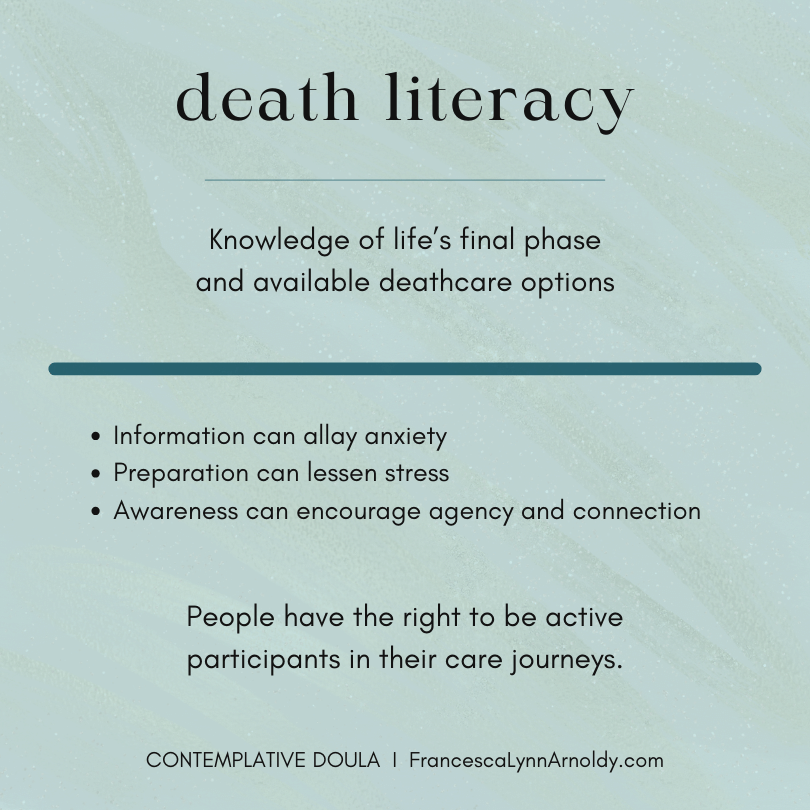 As death literacy educators, it’s our ongoing responsibility to be familiar with the dying process, the deathcare system, and any available, related resources and beneficial services to enable us to effectively assist others in their journeys.
